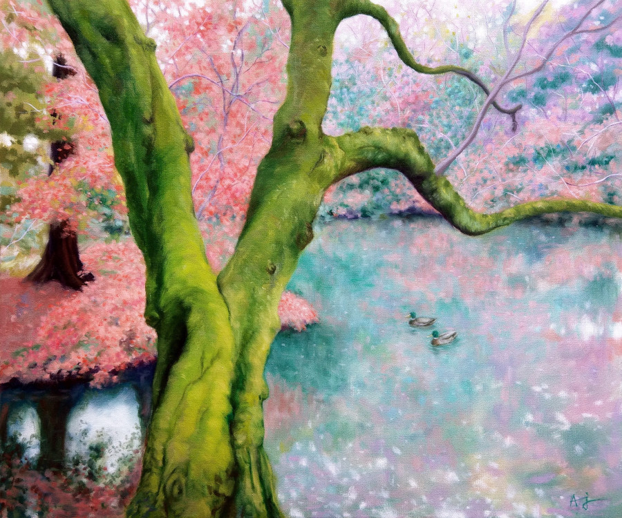 一邊旅行一邊搜集繪畫題材是最幸福的事——秋天總給人蕭瑟的感受,特別是對在台灣平地成長的我而言,四季的色彩似乎都大同小異,直到有一年秋天去東京旅行,自此改變了我對秋天的印象。這幅作品的靈感來自新宿御苑裡的一處水池,秋天將她染上了各種鮮明的色彩,池面上閃爍著迷離倒影,美不勝收,而突然游過我面前的綠頭水鴨,彷彿熱情地歡迎我與牠們一同參加這場斑斕瑰麗的秋日盛宴。(註:已塗保護凡尼斯)