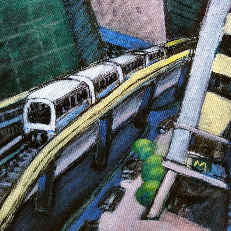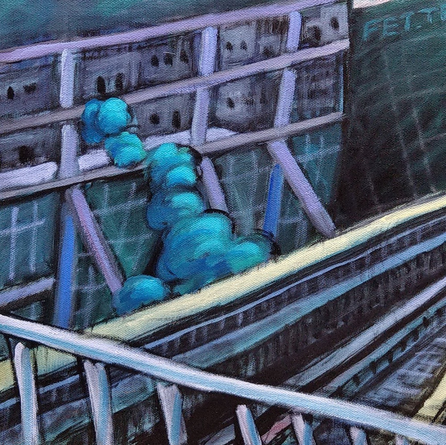 台北的西湖捷運站為創作靈感,目的則是為了紀念曾經歷過的北漂生活——緊張快速的生活步調,每天固定搭乘捷運往返於公司與租屋處,而平日上班時最期待的就是放假,但當假期結束時內心又會惶惶不安,覺得雙腳沈重不想進公司,就這樣日復一日……當身心的疲乏積累到一定程度時,便開始思索自己想要過怎樣的生活……終於,我回到了故鄉,重新開始朝自己的理想生活前進,最要緊的是,Bye Bye, my blue Monday。