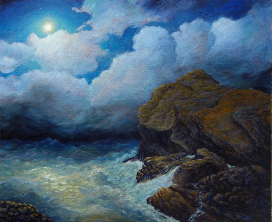 去年年底曾到花蓮石梯坪一遊,那裡的怪石嶙峋令我印象深刻。當天天氣不佳,風強之外還下著斜斜的細雨,岸邊掀起的巨浪著實讓我心驚。當要將此風景入畫時,我反向操作——把白天畫成夜晚、雨天變為晴天、巨浪削弱成小浪,並且加上巨岩與月娘相望的橋段,讓畫作散發一種溫柔浪漫的氛圍,最後在月娘與巨岩之間添上幾隻海鳥,彷彿聆聽著月娘與巨岩的對話……。