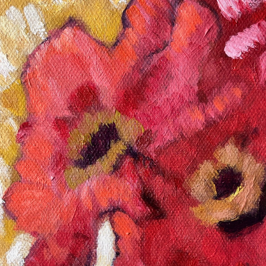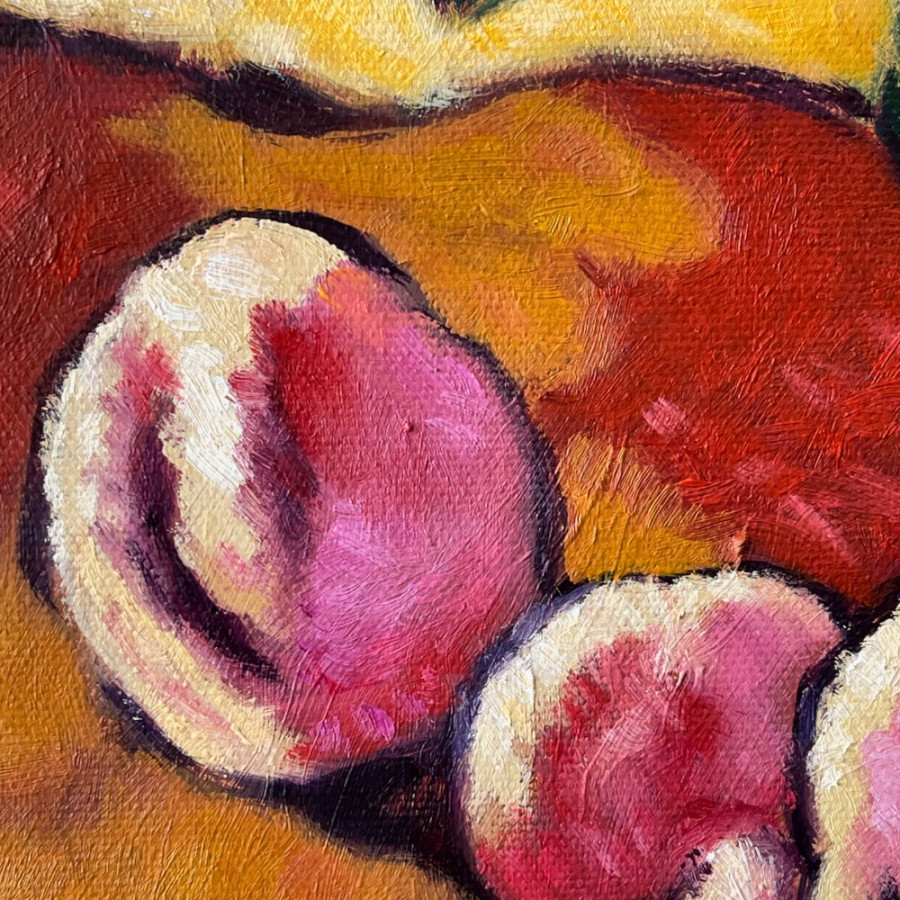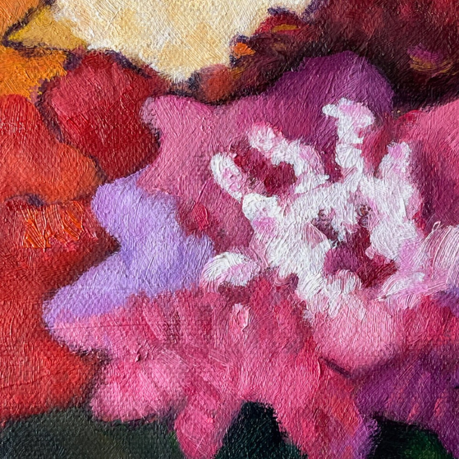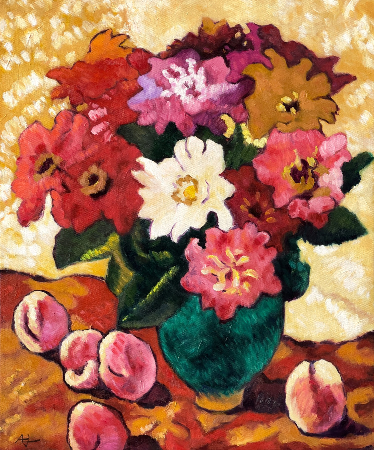法國畫家 Louis Valtat 的用色一向大膽而鮮明,在這幅暖色系的畫作中,花朵、水蜜桃和花瓶的造型散發出樸拙的童趣,利用粗獷的筆觸、簡單的色塊和變形的輪廓使花朵更富個性及生命力,也讓我們充分感受到 Valtat 對於繪畫的熱情和創作時的快樂。而金黃色的背景,既突顯了主題,也像是替畫作打光似的,讓整幅作品充滿了明亮的張力。