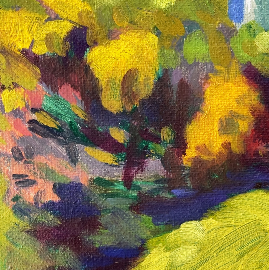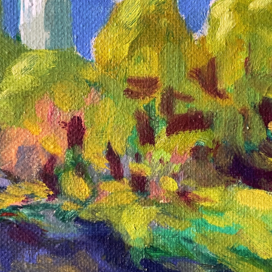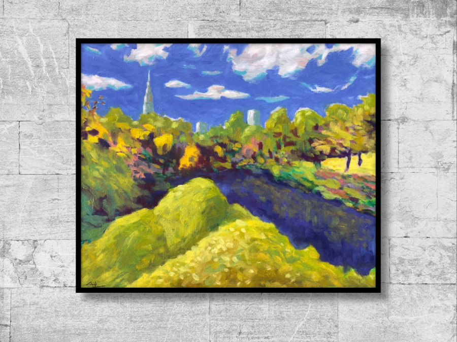 這幅畫作用色鮮明、對比強烈,又以帶有秋意的黃綠色為主色調,搭配深藍色的天空,讓人彷彿置身於空氣冷涼又清新的東京深秋之中。而在詮釋中後景的層層樹群時,則採用具象寓於抽象的形式,透過隨性不拘的筆觸,表現出大自然旺盛的生命力。此外,在鬱鬱蔥蔥的樹林後出現的高樓大廈,則產生了一種人造建物與自然景緻的對比趣味,也讓旅途勞頓中的我有了充分喘息、放鬆的空間……然後繼續我的美妙旅程。