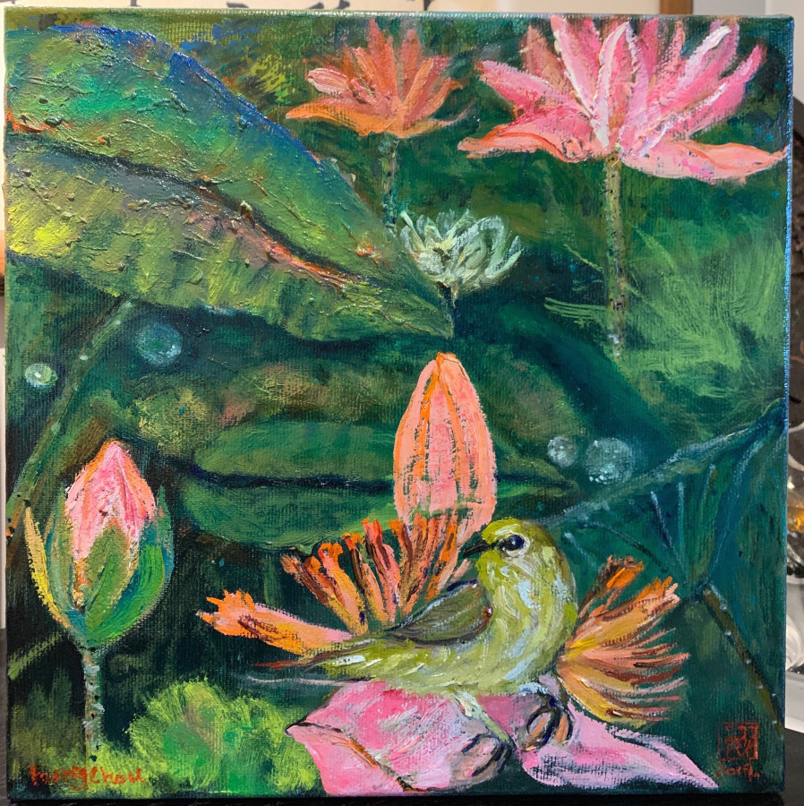 華葉粉荷映翠鳥