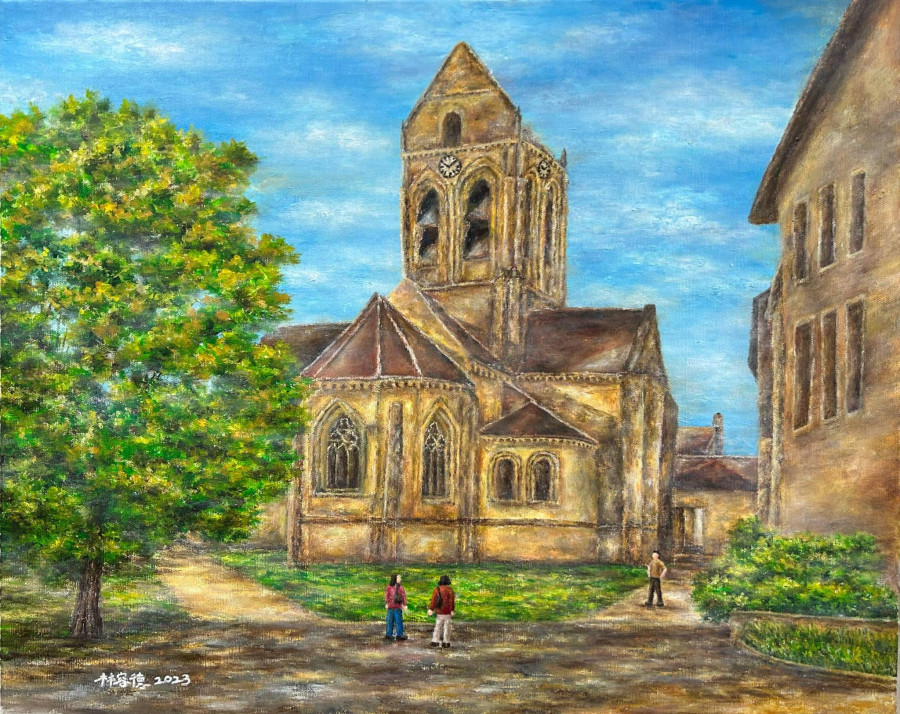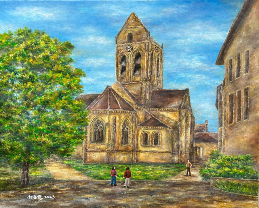 2023年9月份時,自己跟團至法國巴黎旅遊,來到知名已故名畫家梵谷曾經所描繪的知名地標奧維教堂,因此也決定臨摹創作。